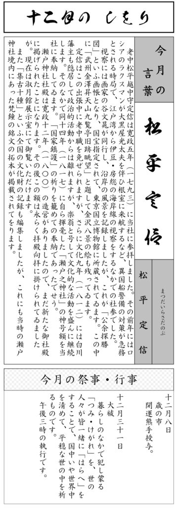 老中松平越中守定信は寛政五年(一七九三)に当社に参拝しました。